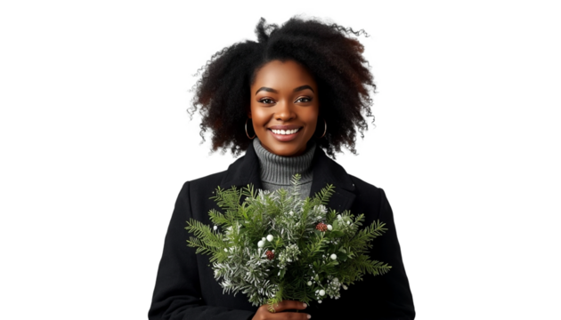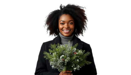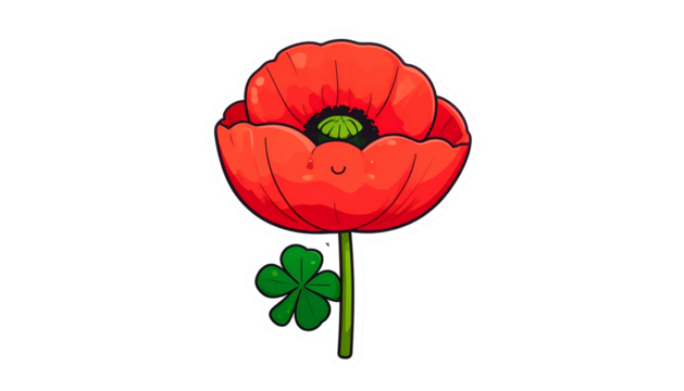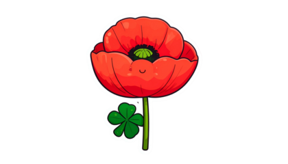 Cartoon poppy with a clover, against a black backdrop, happy expression