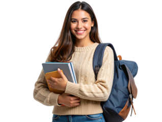 A young, smiling female student with a backpack and books isolated on a transparent background