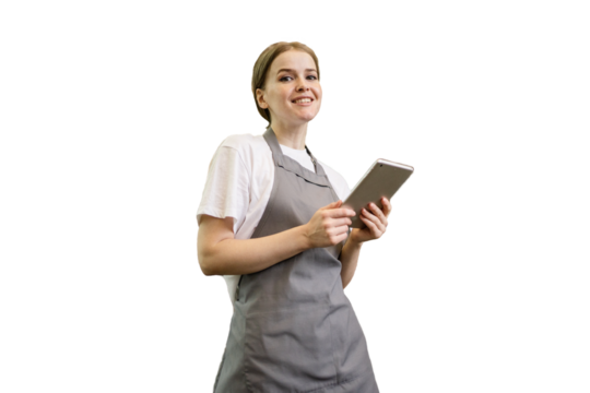 A young woman smiling employee in uniform using a tablet in her hands isolated transparent background, png.