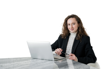 The student is a smart smiling young woman with curly hair in a white shirt and glasses. A freelancer employee in the office uses a tablet. Transparent background, png.