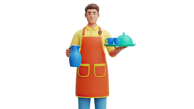 Smiling waiter with yellow mug on transparent background
