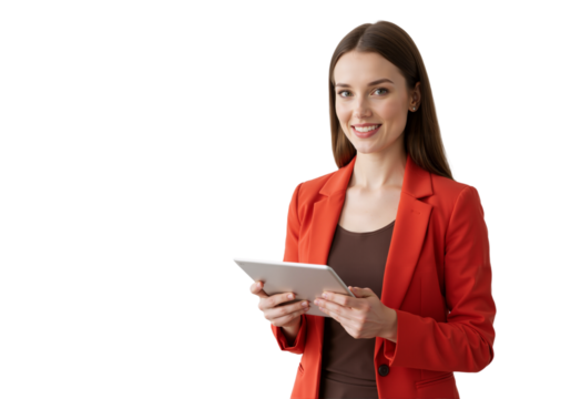 Confident woman in a red blazer smiles while holding a tablet, exuding professionalism against a transparent background (PNG).