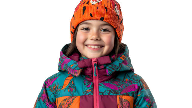 Child smiling in winter clothing on transparent background