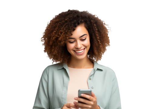 Professional businesswoman smiling while using her mobile phone on transparent background