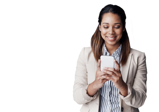 Young businesswoman smiling, reading or texting on mobile phone, showing communication, networking and technology concepts, transparent background