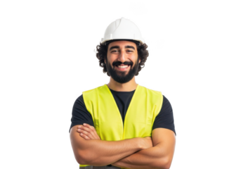 Confident construction worker in safety vest and helmet with arms crossed, isolated on transparent background