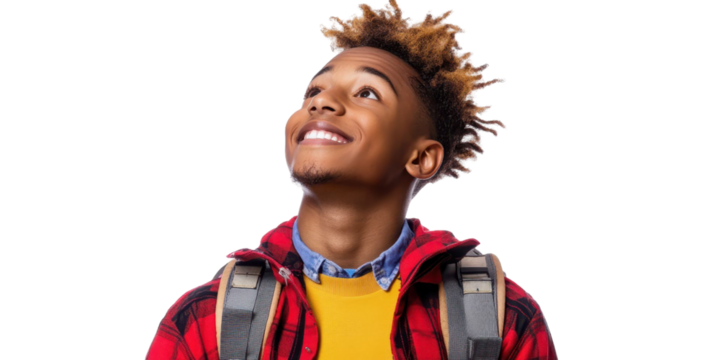 Cheerful man in a cozy orange sweater, smiling and raising hands in excitement, on a white isolated background.