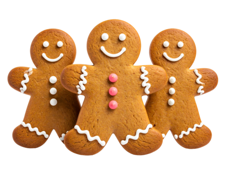Three smiling gingerbread cookies, two with white, one pink buttons