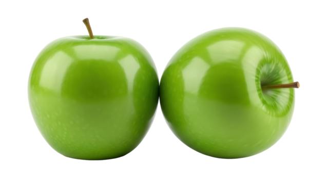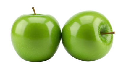 Two shiny green Granny Smith apples PNG isolated on transparent background, fresh fruit for healthy eating and cooking concepts
