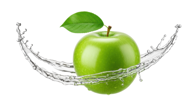 A vibrant green granny smith apple with a fresh leaf, surrounded by dynamic water splashes and sparkling droplets, against a transparent studio background. Concept for crispness and vitality