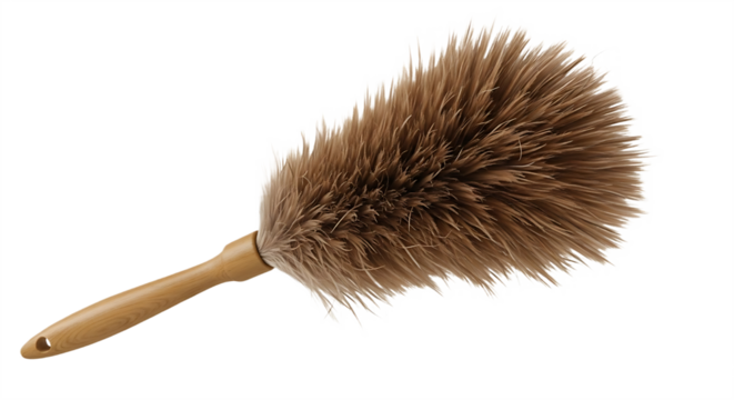 A fluffy feather duster with a wooden handle, isolated on a transparent background for cleaning