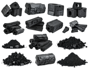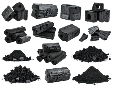 Arrangement Of Various Charcoal Pieces And Piles On Transparent Background