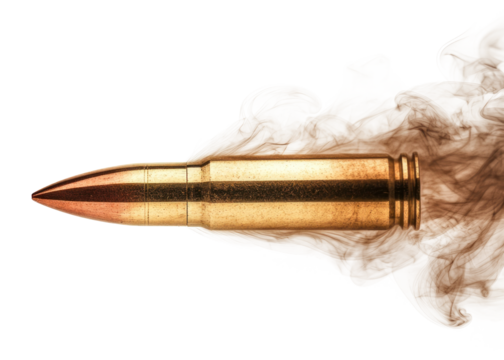 Golden bullet projectile, leaving a trail of smoke against a dark void, isolated on a transp.png
