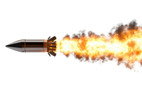 Missile rocket launch with bright orange fire and dark smoke trail isolated on a transparent background