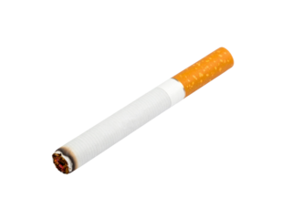 Lit cigarette with pink smoke wisps rising upward, isolated on a transparent background