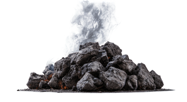 A pile of dark gray charcoal with rising wisps of white smoke against a transparent background