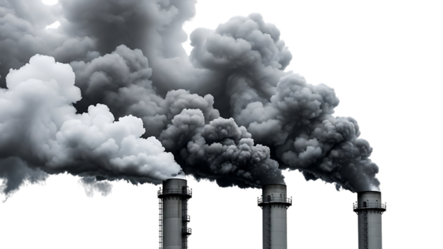 Industrial smokestacks emitting large plumes of smoke isolated on a transparent background pollution