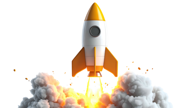 A cartoon rocketship blasting off, trails of smoke and flame against a dark background