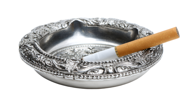 Ashtray with cigarette butt and ash, symbolizing smoking addiction, bad habit, and health risk, on transparent background