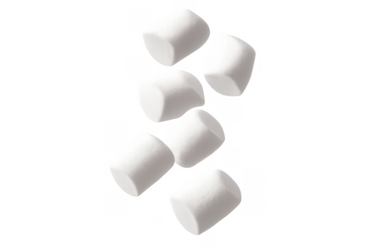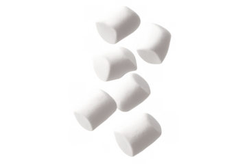 Falling white marshmallows on transparent background representing sweetness, dessert, and confectionery snacks
