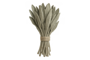 Photograph of a bundle of sage smudging sticks, their smoky aroma filling the air, depicted on a transparent background.