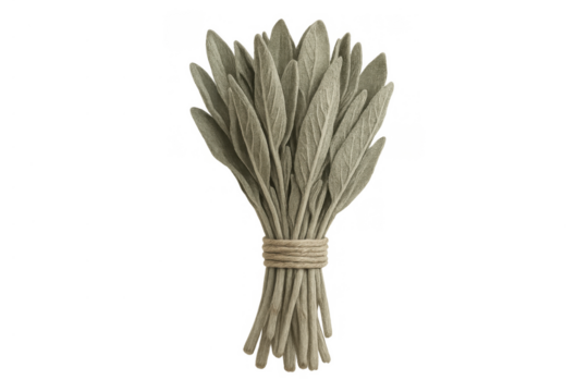 Aromatic sage bundle tied with natural twine showcasing traditional smudging practices and holistic energy clearing isolated on transparent background PNG