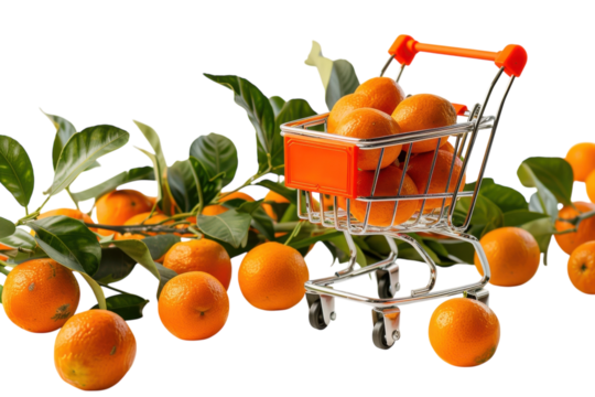 A vibrant display of fresh oranges in a miniature shopping cart surrounded by lush green leaves, creating a delightful market ambiance isolated on transparent background