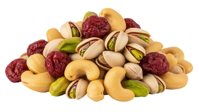 Pile of mixed nuts isolated PNG, including cashews, pistachios, and cranberries, healthy snack food on transparent background