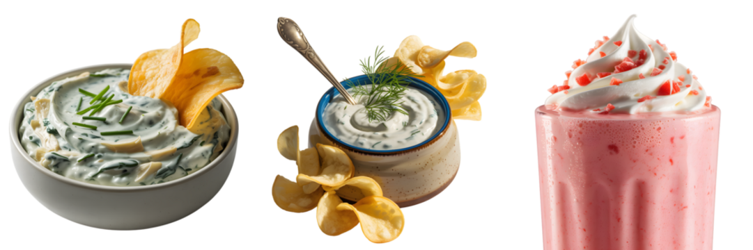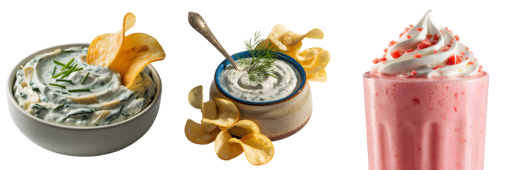 Delicious dips and smoothies with chips isolated on transparent background