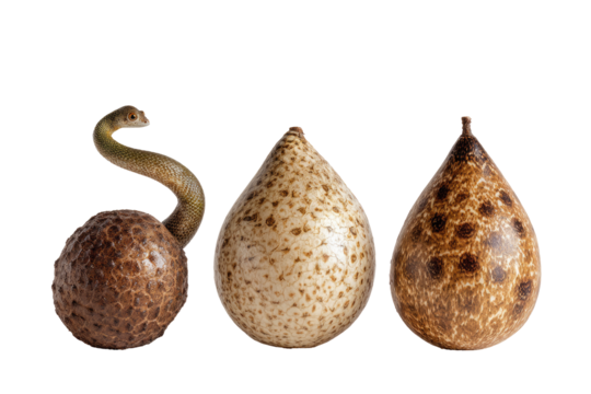 Three brown eggshells, patterned like animal skin, surround a snake, one split open