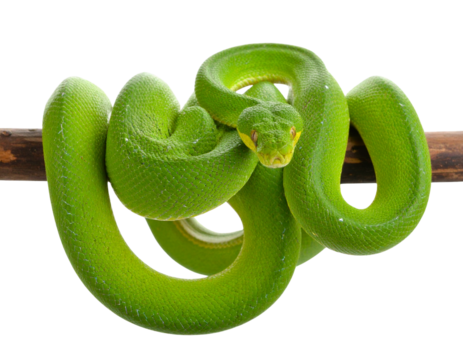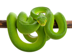 Emerald tree boa PNG isolated on transparent background, green snake with yellow markings, exotic pet for wildlife and nature designs