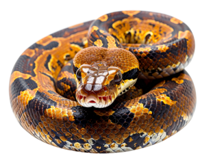 Close-up of a coiled python snake with intricate patterns on its scales.