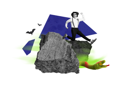 Composite trend artwork collage of halloween autumn season spooky creepy day young guy face mask muertos jump stone death day snake animal