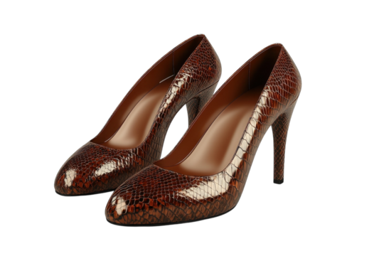 Elegant brown snakeskin pumps poised for a confident evening, sleek design with a subtle sheen against a clean white background.