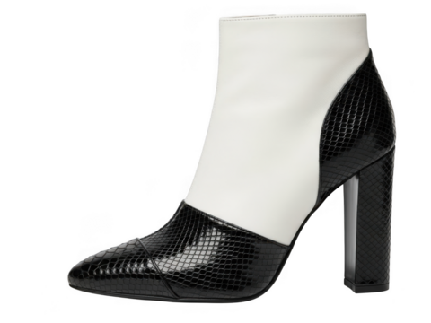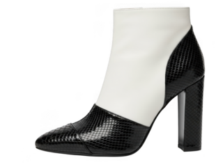 Black highheeled ankle boot with snakeskin texture on transparent background