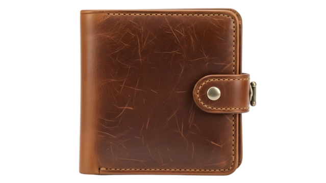 Close-up of a textured, brown, leather wallet with a metal snap closure. The surface has an embossed design