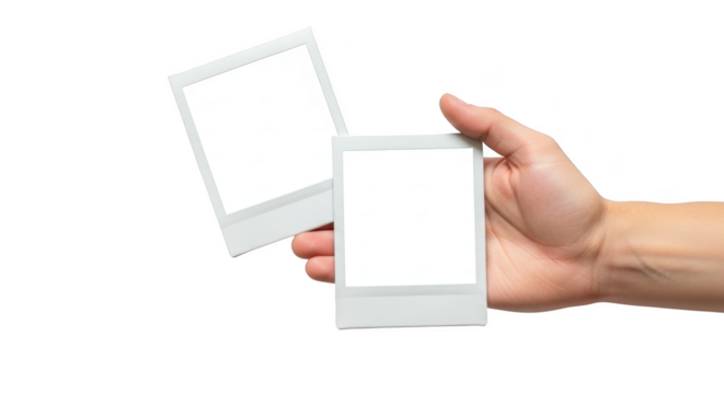 Hand holding two blank instant photo frames isolated on transparent background