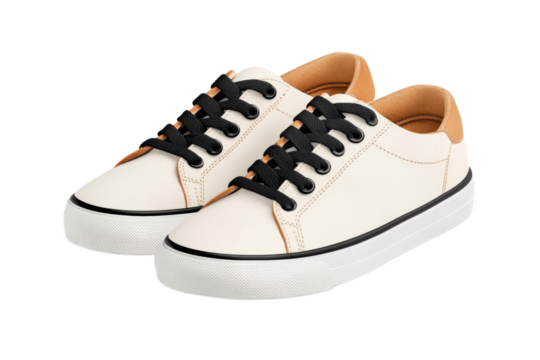 Pair of white leather fashion sneakers with brown sole floating on transparent background