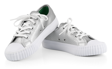 Silver sneakers isolated on transparent background with shadow. Full Depth of Field