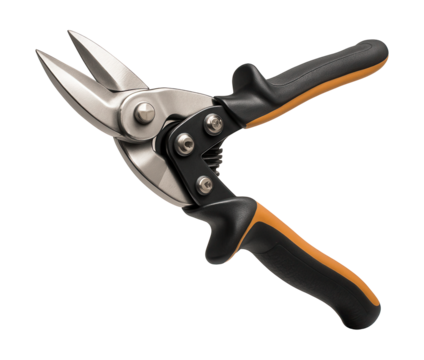 Yellow handled plier and two metal snips with black and red handles transparency background, practical tools for cutting and gripping metalwork