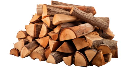 Stack of cut logs firewood isolated on white background, showing natural wooden texture, chopped timber pieces arranged for burning, perfect for camping, heating, forestry, and rustic themes