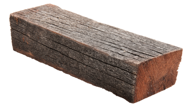 A weathered, rustic timber beam or railroad tie, showcasing its rough, aged texture and cracked surface, with a reddish-brown cross-section. background removed