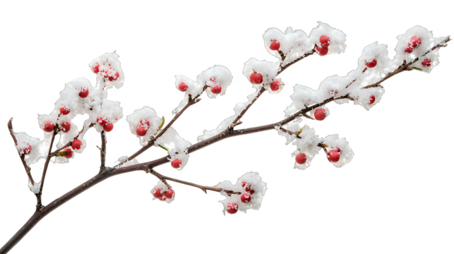 a tree branch covered with white snow and red berries against a transparent background, PNG image, PNG file, Generative art.