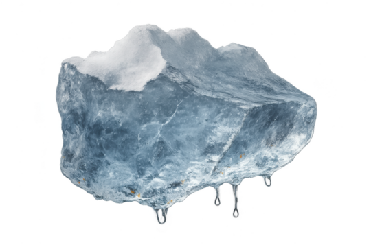 A large, textured block of melting ice with snow on top, isolated on a black background.