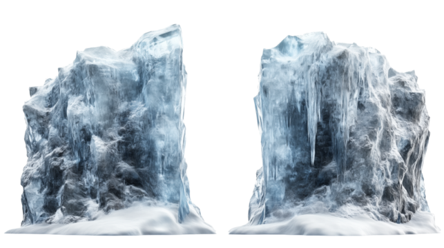 Iceberg, blue ice mountain with white snow and deep crevasses, steep terrain of ice, glacier landscape, blue ice mountain covered in snow, on a transparent backgrounds