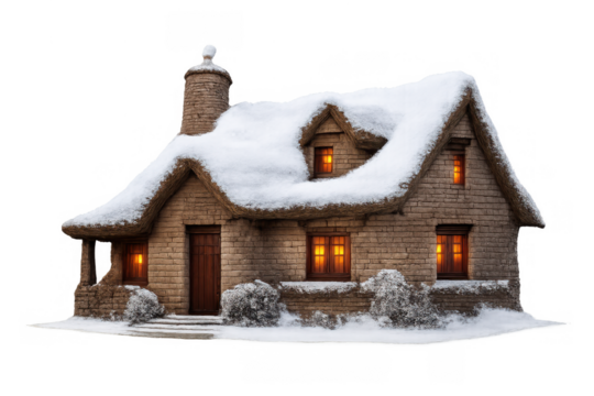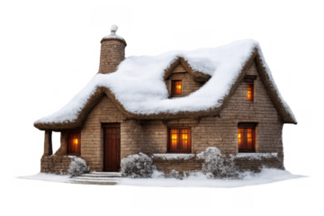 Charming snow-covered cottages with christmas lights and full moon on transparent png