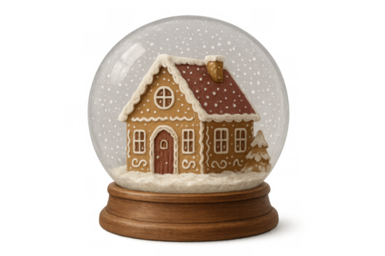 Gingerbread house in a snow globe with falling snow, festive christmas holiday decoration and winter celebration concept