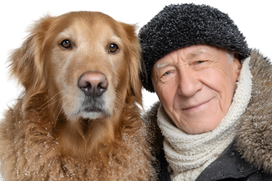 A playful golden retriever joyfully holds a snow-covered bone in a winter wonderland setting