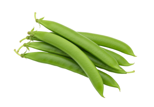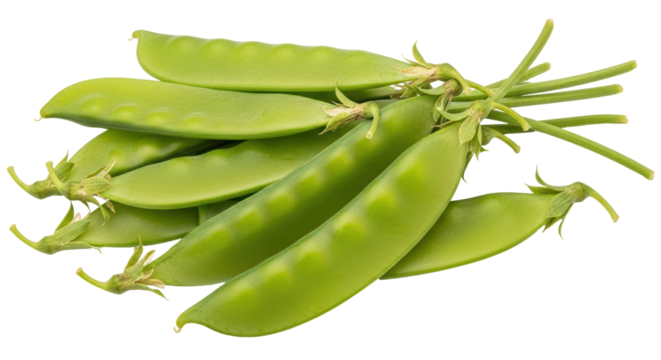 A bunch of green snap peas are sitting on a white background