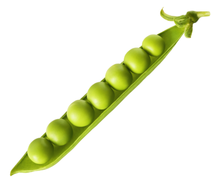 Whimsical cartoon pea pod with smiling peas on transparent background
